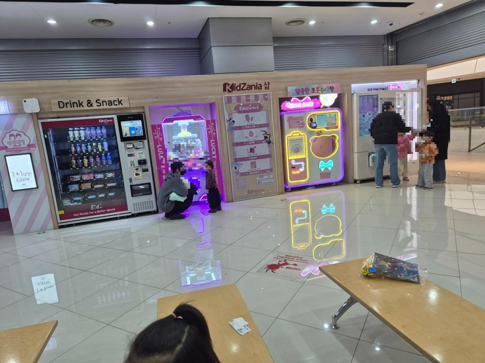 대기하는 시간이 조금 있을 수 있는데, 로비에는 아이들의 시선을 사로잡는 솜사탕과 아이스크림 자판기들이 줄지어 서 있답니다. 기다림도 지루하지 않게 만드는 마법의 자판기들이죠!